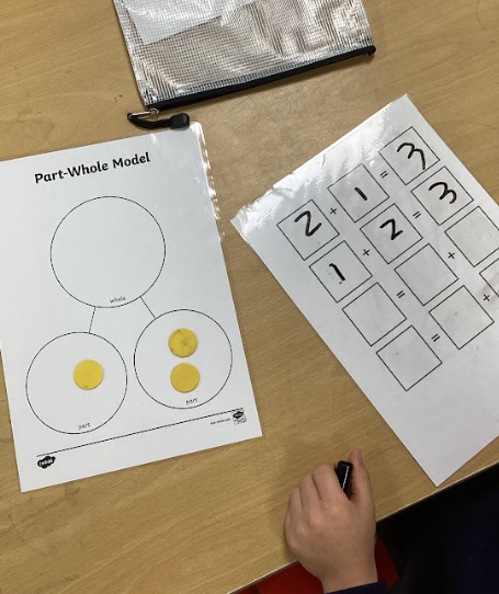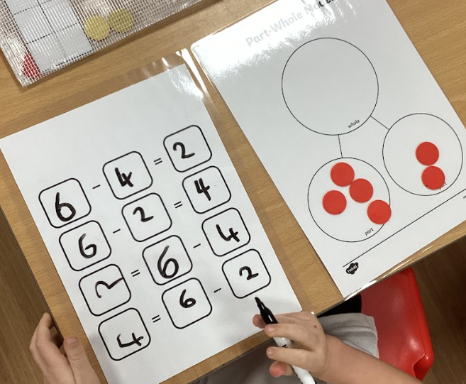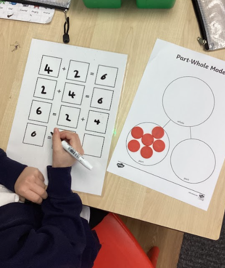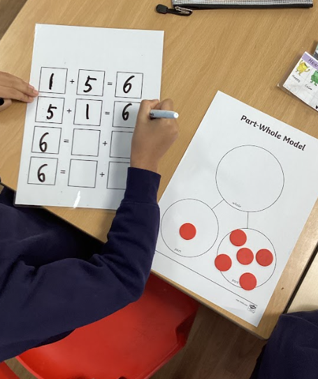 During our maths lessons, we were introduced to the part-whole model. We needed to understand that when two parts are put together, they make a whole. Later, we then learnt that we can use these numbers to create different number sentences. We practised these on our whiteboards before completing the tasks in our books.