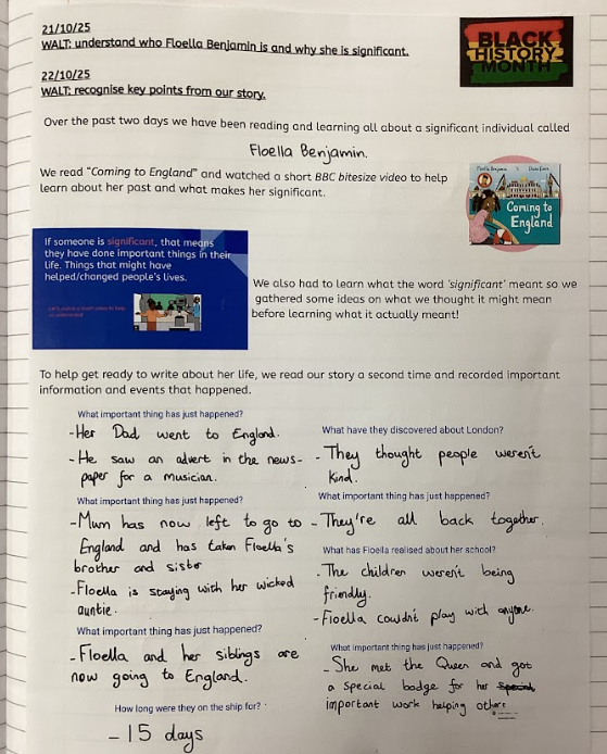 Year 1 has been busy bees with our brand-new English topic, which is focused on Black History Month. The children have been learning all about Floella Benjamin and what makes her so significant. We have read her book and learnt lots of amazing facts. The children have been creating sentences based on events that Floella told us about in her book, Coming to England.