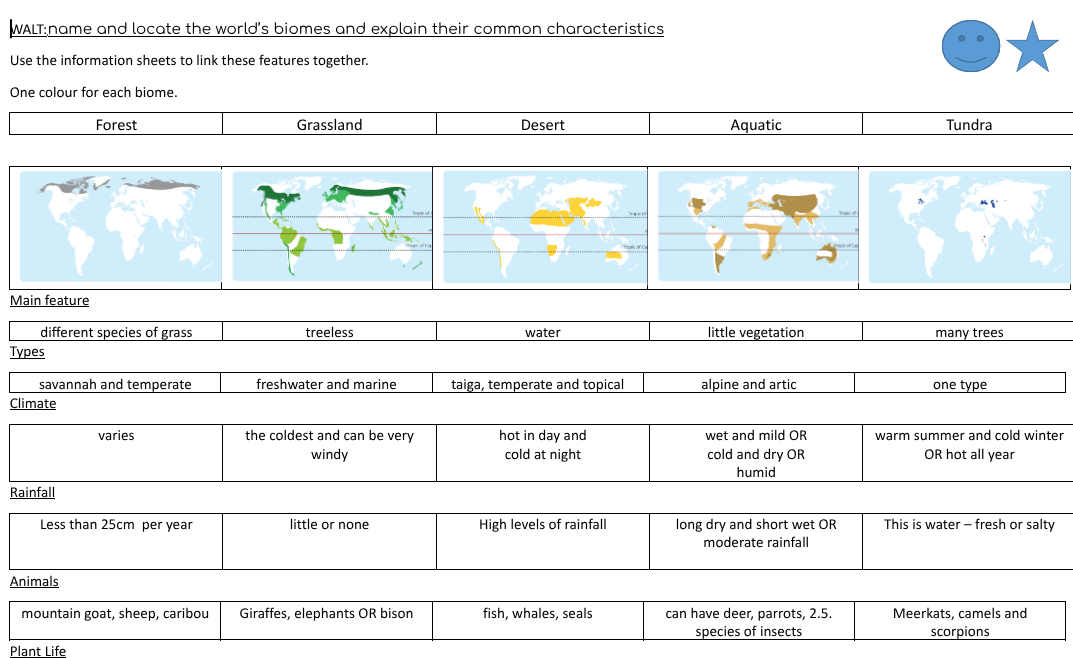 The children explored the biomes of the world and their key characteristics using a range of sources. We then completed an activity where we had to match the right characteristics to the right biome: