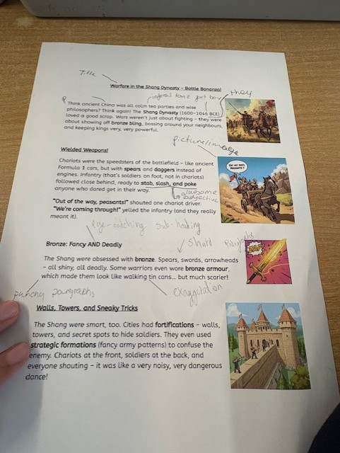 In English, we are putting the children’s knowledge of the Shang Dynasty to the test by applying this within our English unit, ‘Horrible Histories: The Shang Dynasty’. The children have been exploring a range of information texts to unpick the layout and language features.