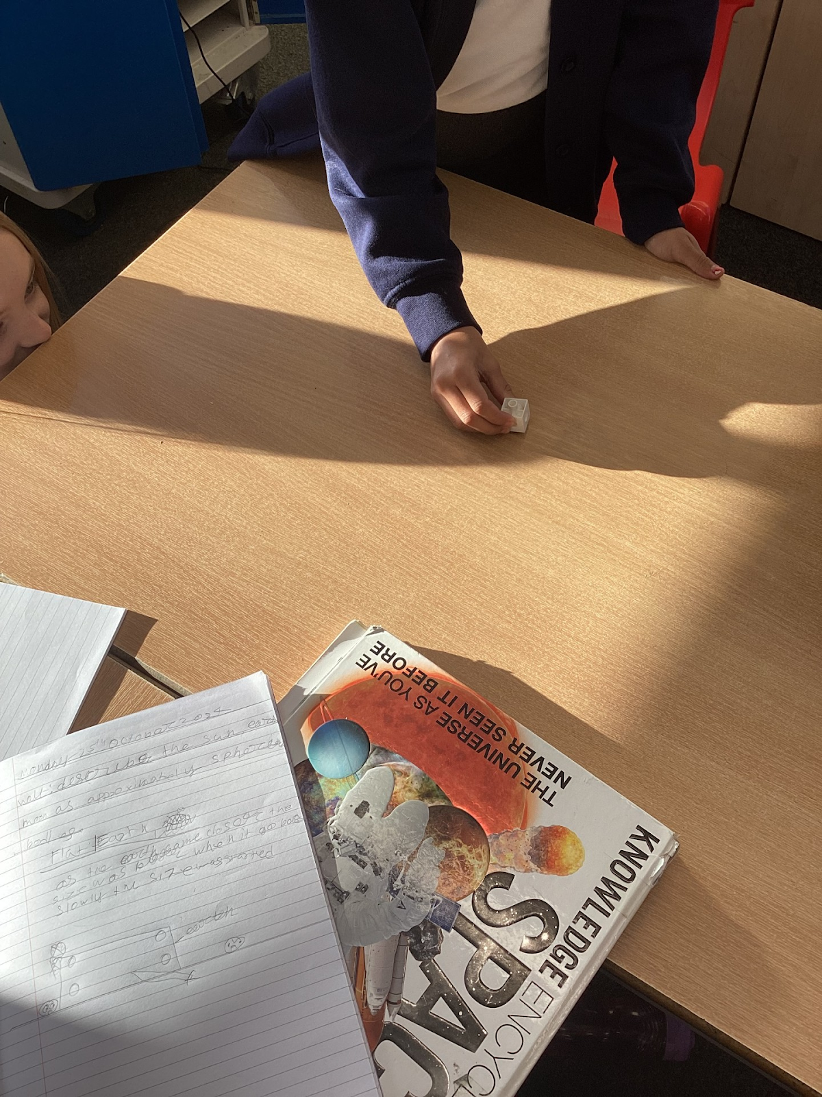 In the next session, we conducted an investigation to replicate Aristotle’s observations of ships disappearing over the horizon and determined that the Earth is spherical. We did one investigation where we imagined that the Earth was flat, and used a cube to represent a ship travelling over the horizon (our table tops) to investigate what we would observe. In the other investigation, we used a cube stuck onto a ball to also represent a ship travelling over the horizon. We concluded that this is what happens on planet Earth, as it is a sphere. We discussed that this proves Aristotle’s theory.