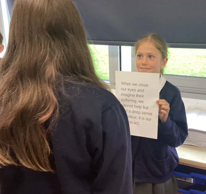 This week, Year Six have continued their powerful English unit on anti-slavery speeches, focusing on how to deliver words with intonation, passion, tone, and pace. Building on their understanding of persuasive techniques and historical context, the children took part in a class “walking read”, bringing the speeches to life through movement and expression.