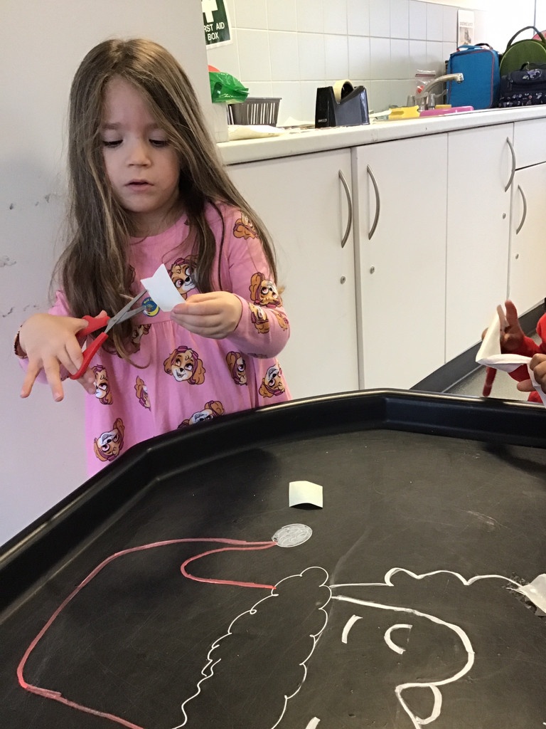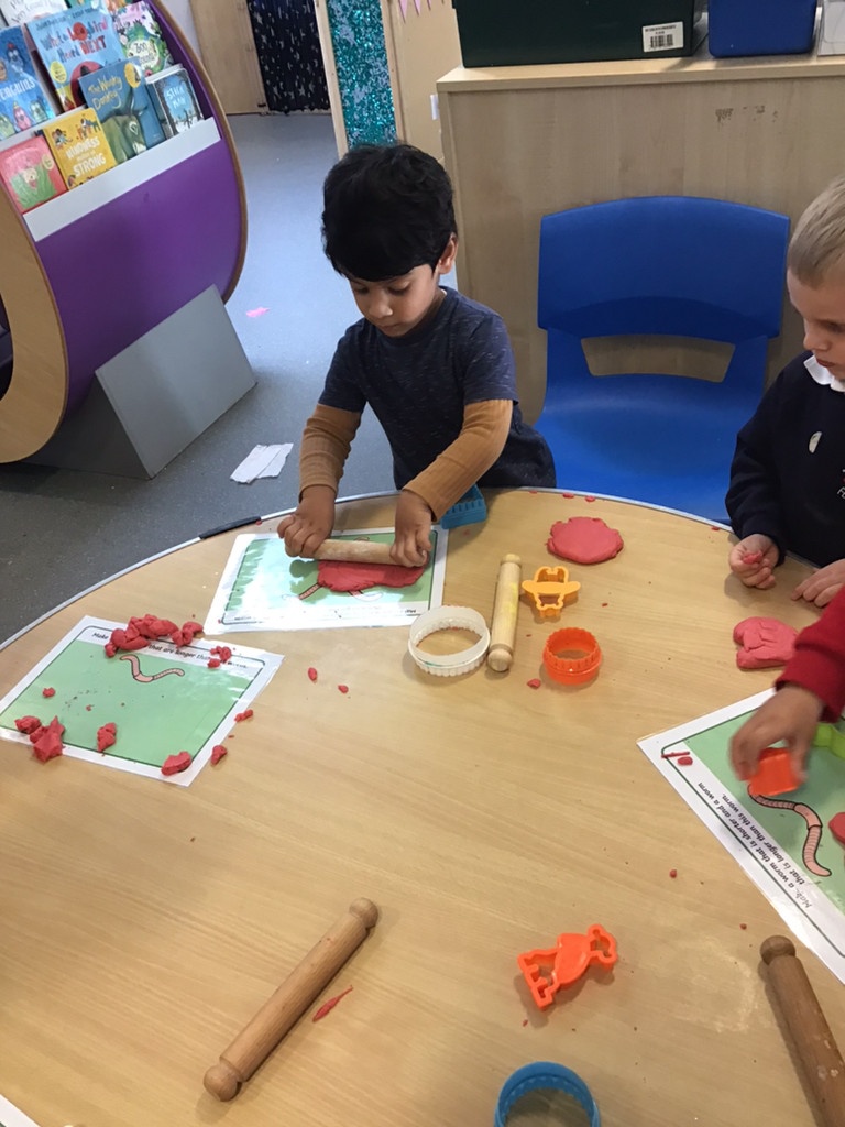 We continue to work on our fine motor control and during structured play the children used knives and forks to cut play dough food such as sausages, pie and pizza.