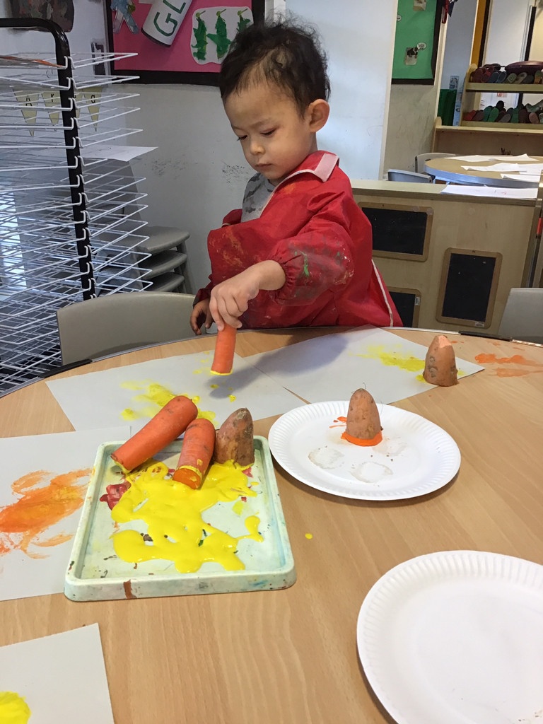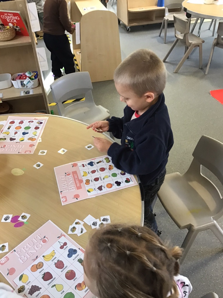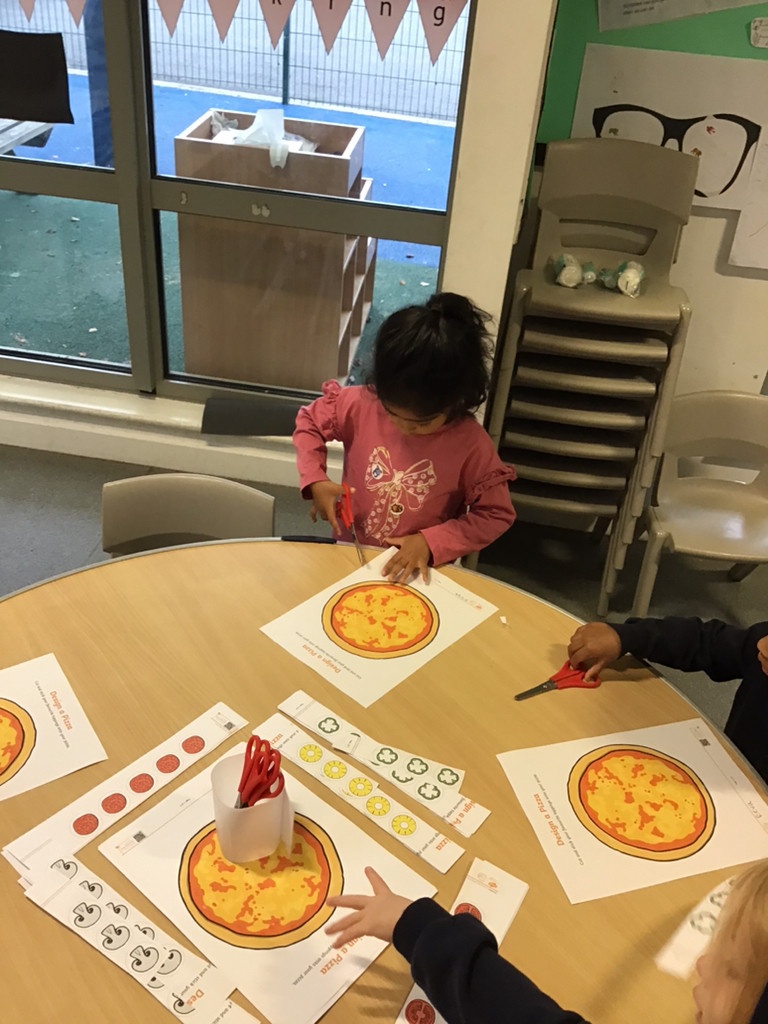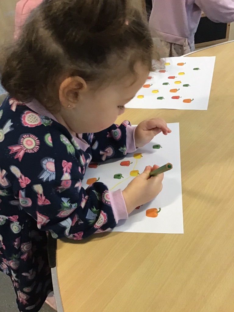 In the creative area the children have been creating their own food related crafts, designing a pizza, printing with fruit and creating our own rainbow salads. We are developing our confidence in mark making to create zig zags, curves and lines to create images of different fruits. Some children have also been drawing the fruit bowl full of fruit with lots of detail thinking about the colours they need to use.