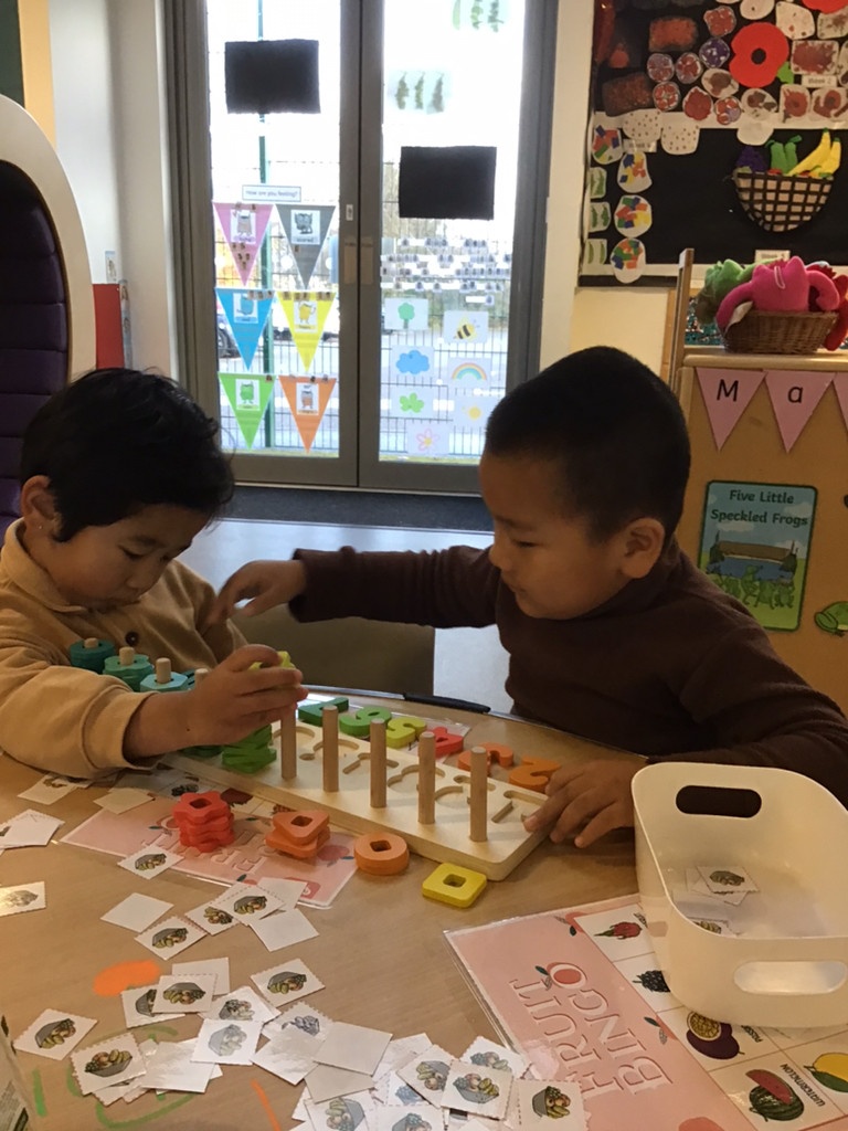 During our whole class sessions the children are developing their listening skills to try and identify sounds that are the same and different. If you have instruments at home try to make two sounds and encourage the children to identify if the sound is ‘the same’ or different.