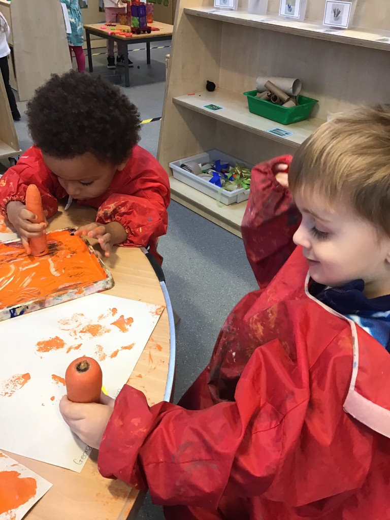 We have been delving into the book "Which food will you choose?" It looks at food of all different colours and encourages children to explore different food. To support this we have a 'talking table' with a variety of familiar and unfamiliar fruits and vegetables. At the start of the week the children were only able to look at them and were encouraged to talk about what they could see. The children were supported to respond in sentences trying to describe and name the food in front of them. We then used our sense of smell to smell the food to decide if we thought we might like to try it. Finally the children were able to touch and try the food they felt comfortable exploring. Many of the children tried new things and even enjoyed much of what they tried including beetroot, pomegranate, butternut squash and lemons.