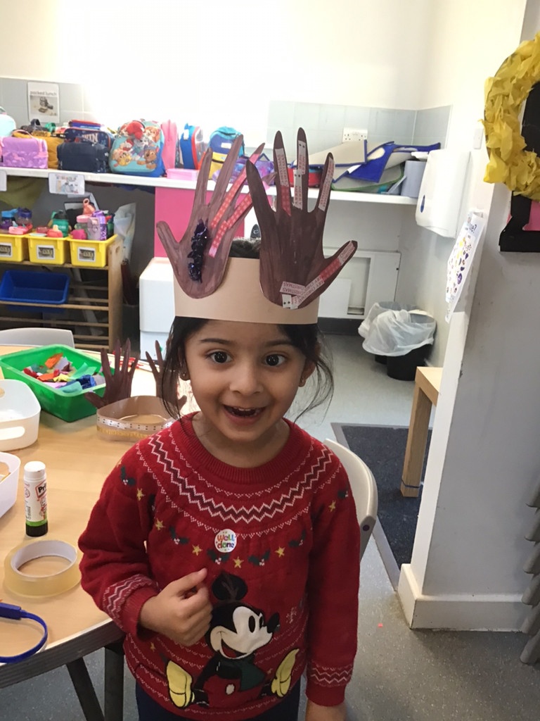 Monday was a very busy and Christmas-filled day! It was our Christmas Jumper Day where adults and children dug out our most festive Christmas jumper to accompany our Christmas Lunch. The children thoroughly enjoyed wearing their Christmas crowns and listening to music while eating their lunch. We talked about the foods we eat at home over the festive period.