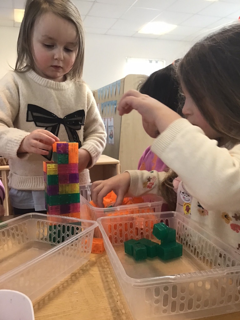 During our daily maths we have been hearing and saying number names; joining in with number rhymes and saying some number names in order. This has been followed by exploring number rhymes on the maths table using small props and singing to our friends as well as counting the blocks we use as we build.